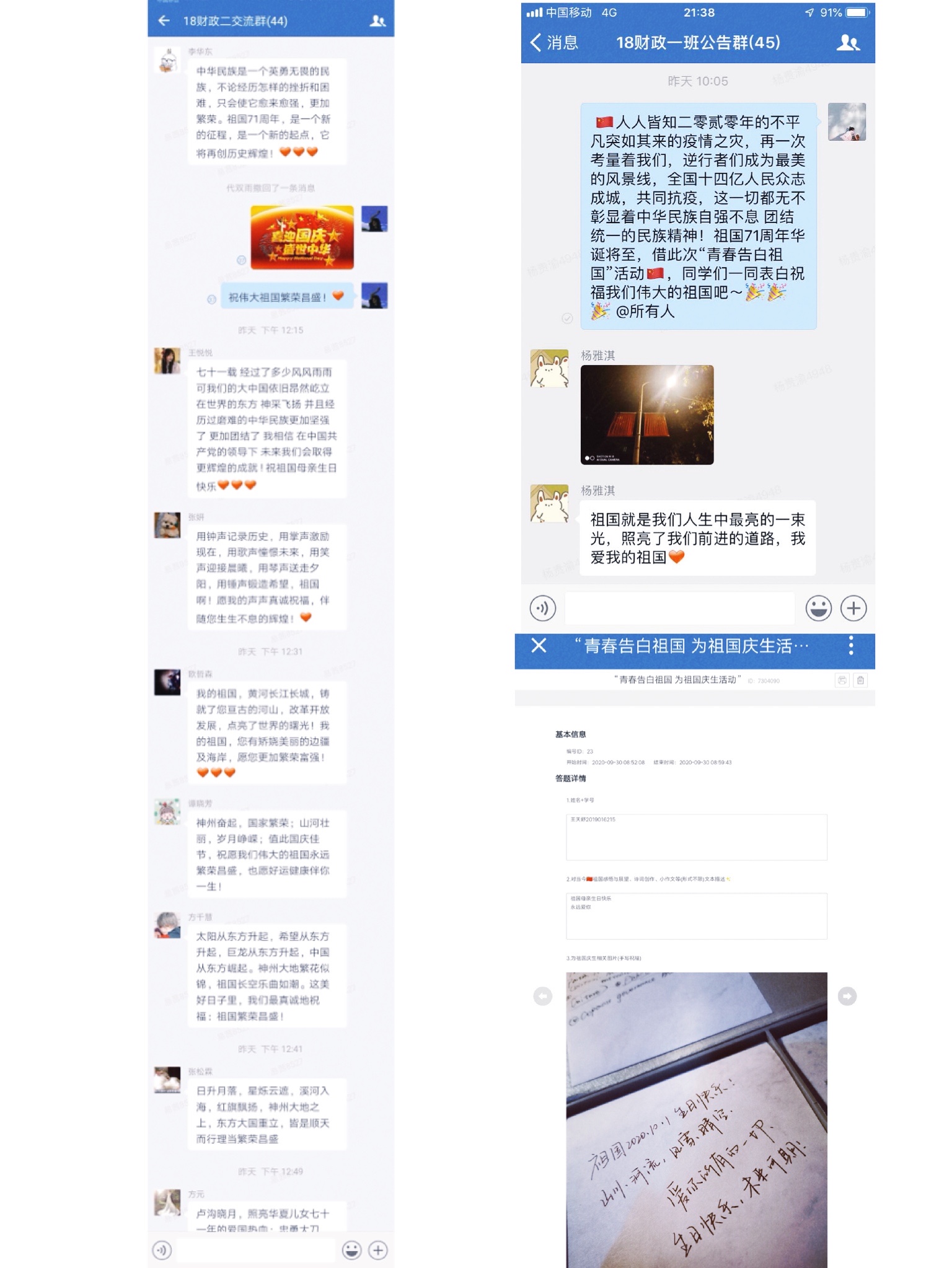 本次“青春告白祖国”线上活动,激发了经院青年学子对祖国的热爱与自豪感,增强了广大经院青年学子的社会使命责任感,坚定了当代青年的理想信念。18级国贸二班的张昊敏表示,在同学们对祖国的祝福中,她亲身感受到了国家的强大与民族的富强,在感到自豪的同时也更加想要努力变得更好去报效祖国。19级经济学三班的马昕说到,随着祖国的不断强大,他对祖国的热爱之情也愈发强烈,他希望自己能够在学习方面有所精进,将来为祖国贡献出自己的力量。