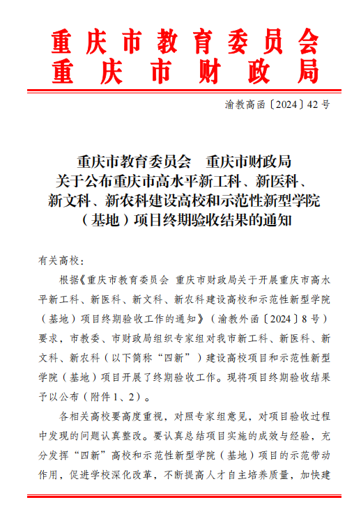近日,重庆市教育委员会依据《重庆市教育委员会 重庆市财政局关于开展重庆市高水平新工科、新医科、新文科、新农科建设高校和示范性新型学院(基地)项目终期验收工作的通知》(渝教外函〔2024〕8号),正式揭晓了重庆市普通本科高校基础学科人才培养示范基地的验收成果。公司经济学拔尖人才培养示范基地凭借卓越表现,荣获“优秀”评定,顺利通过市教委验收。